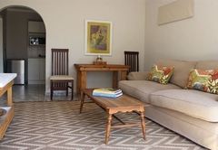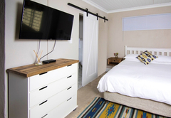 This unit is suited to accommodate two guests and comes equipped with a Queen-size bed and an en-suite bathroom fitted with a shower and bath. Additional mattresses can be arranged to accommodate two children. The kitchen comes equipped with a fridge, microwave, stove, oven, toaster and kettle. There is a lounge and dining area, a TV with DStv, Wi-Fi and tea- and coffee-making facilities. Also included are an iron, fan and hairdryer.