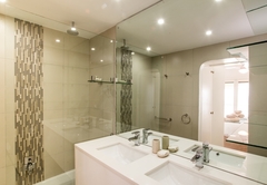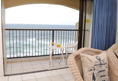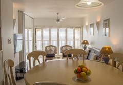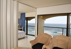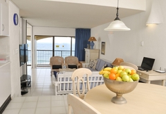 802 Bermudas Holiday Apartment offers three double bedrooms and can accommodate a maximum of six guests. There is a queen sized bed in the main bedroom, with two twin beds (which can be converted into king size beds upon request) in each of the remaining two bedrooms. The main bedroom is en-suite, while another bathroom services the other two bedrooms. Both bathrooms have a bath / shower combination. Free high speed Wi-Fi is available throughout the apartment, as well as full DStv (Satellite TV) selection on the flat screen TV in the lounge. From the lounge are sliding doors which lead you onto the patio with amazing 180 degree sea views, perfect to enjoy your morning coffee or evening sun downers. The open plan dining room features a dining table that comfortably seats six people. The spectacular views can also be enjoyed from the dining room table. The kitchen is fully self sufficient and comprises a fridge, microwave oven, washing machine, dishwasher and under counter oven with hob. The apartment is fully air conditioned, with a heating option also available for the winter months. Each room also has ceiling fans.