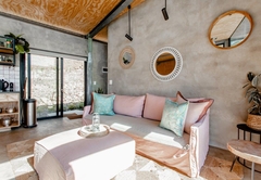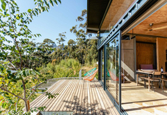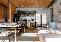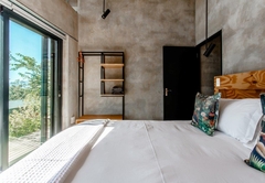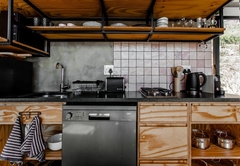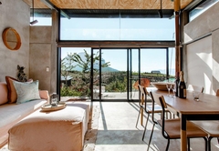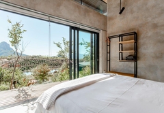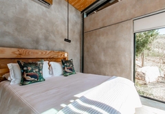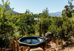 Almond Cabin is a light filled, modern cabin with direct access to endless hiking and the finest mountain biking trails in the Western Cape. It features a main bedroom furnished with a Queen-size bed and an en suite bathroom fitted with a shower, toilet and basin. Although it is styled as a two person cabin, there is a Queen sized pod attached to the living room which can sleep two children or an extra guest for an extra cost. The kitchen / dining area is equipped with a two pan gas hob, a microwave, dishwasher, fridge / freezer and a wood burning fireplace. There are ceiling fans in the rooms and air conditioning in the main bedroom. The deck has seating and braai facilities.