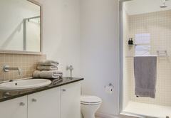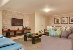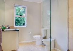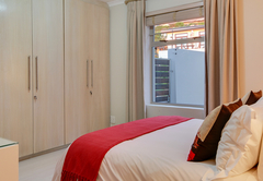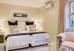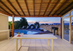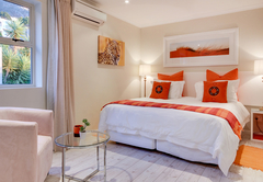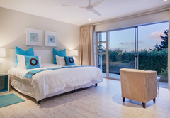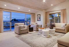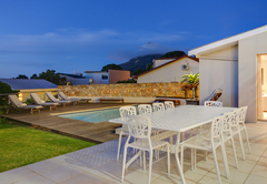 The self catering villa has eight bedrooms, all of which have an en-suite bathroom. The rooms are furnished with either a King-size, double or Queen-size bed and all have air conditioning. Some rooms lead onto the swimming pool and garden. The spacious interior is styled in neutral tones with accents inspired by African nature. There is a spacious lounge with a gas fire place, a dining area, a TV room with a guest bathroom and shower and a cocktail bar with comfortable seating. The kitchen is large and well equipped for your self-catering needs. Appliances include a dishwasher, two fridges, two ovens, a washing machine and tumble dryer. The villa has dining space for 24 guests inside and 14 outside. The outdoor area has a swimming pool (heated on request in winter) with a wooden deck and grassed lawn. Braai facilities are provided and there is garage parking.