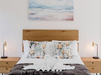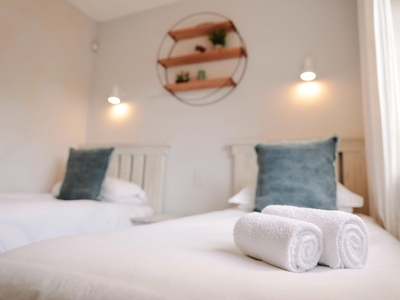 This stylish apartment comfortably sleeps up to four guests across two bedrooms, offering one double bed and two single beds. Each bedroom features its own en-suite bathroom with a shower, ensuring added privacy and convenience. The open-plan living area is bright and inviting, seamlessly connected to a fully equipped kitchen, perfect for a relaxed and hassle-free stay.
