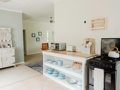 Guests can enjoy a range of modern amenities, including complimentary Wi-Fi, a TV with Netflix, a ceiling fan, and a comfortable sitting area. Practical additions such as an iron, ironing board, and tea and coffee-making facilities ensure a well-rounded experience. The kitchen includes everything needed for self-catering, with a refrigerator, microwave, oven, toaster, and ample workspace.