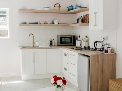Guests can enjoy a full suite of amenities, including complimentary Wi-Fi, a TV with Netflix, a ceiling fan, a dedicated sitting area, and a work desk. The kitchen is fully stocked with everything needed for easy self-catering, including a refrigerator, microwave, oven, toaster, and coffee and tea-making facilities. An iron and ironing board are also available.