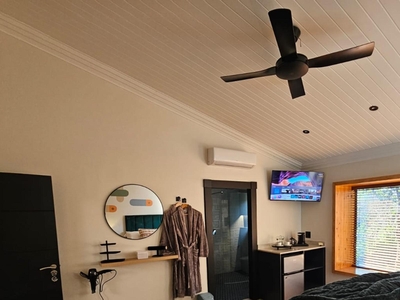 Guests can enjoy modern comforts such as complimentary Wi-Fi, a flat-screen TV with DSTV/Satellite channels and Netflix, air conditioning, a ceiling fan, and a telephone. The room is non-smoking and includes a secure safe, daily cleaning service, and lovely views of the surrounding garden.