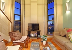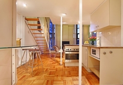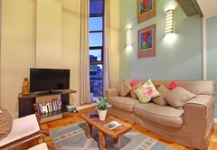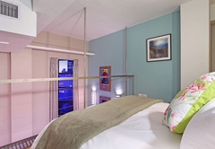 The apartment sleeps two guests in a queen sized bed found on a mezzanine level overlooking the lounge. The spacious apartment is gorgeously decorated and has double volume windows in the lounge offering views across the city. The lounge has comfy furniture, a TV and DStv. A separate study area allows you to work in peace and quiet without distraction should the need arise. The bathroom has both a bath and shower. The modern kitchen has a breakfast bar with bar stools, a hob, oven, fridge / freezer, kettle, toaster, microwave, crockery, cutlery and cooking equipment. There is also a breakfast nook next to the kitchen where you can enjoy your meals.