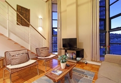 Die Wohnung bietet Platz für zwei Gäste in einem Queen-Size-Bett auf einem Zwischengeschoss mit Blick auf die Lounge.