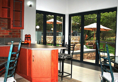 Double bed with open plan lounge (with sleeper couch) and veranda overlooking garden and swimming pool. Fully serviced, including linen and towels, en-suite bathroom with shower and bath. Access to fully equipped farm style kitchen in close proximity to the Lapa.