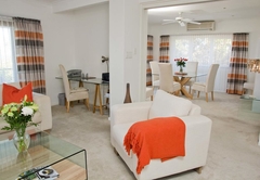 This spacious luxury suite offers you an open-plan kitchen, dining area and lounge. TV, air-con, high-speed internet, landline telephone and fan. The large bedroom has a huge en-suite bathroom. Private garden wit terrace and a Weber gas grill for BBQ's.