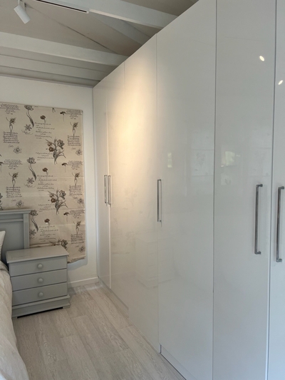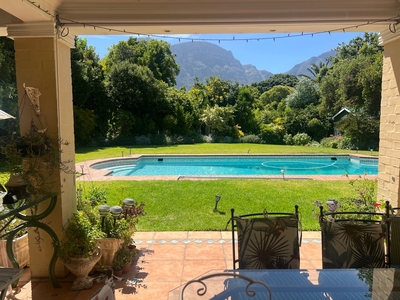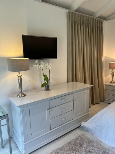 This is a luxuriously large restful space on the upper level of the guesthouse. It is light and airy and tastefully decorated in shades of white. Good for honeymooners or pure self indulgence. Double glass doors open onto a large balcony, where one can enjoy breakfast at the café style table and chairs, or sundowners, or simply sunbathe on the loungers and swing seat. Enjoy magnificent views of the treed garden and huge pool, and wonderous mountain back drop, and the glittering night lights of Newlands and Claremont. The bed is a sumptuous King Extra length, and very comfortably fitted with feather duvet and plenty of pillows, a comforter and electric blanket in winter. The large dressing table can double up as a desk. Equipped with the basics for simple self-catering and food preparation: kettle, microwave, egg boiler, toaster, sandwich maker. Full luxurious bath and shower en suite, with gowns slippers, and generous bathroom amenities. Under carpet heating, central fan plus heat pump for heating or cooling. Comfy couch for “feet up” TV viewing. Flat screen TV with DSTV. Fibre WiFi.