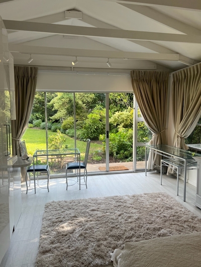 This is a magical open plan living space hidden in its own leafy glen in the beautiful grounds of the main guest house at Avenue Torquay. Decorated in different hues of white, the Garden Cabana is a fully equipped self-catering cottage, which enjoys all the features of the establishment, and all of its beauty and tranquility, with full access to the garden and pool, and other amenities offered by the guesthouse. It has a private deck for out door eating and a large deck for private sunning. Open plan studio style cottage suitable for a single person seeking privacy or a couple. All wooden exterior: all white interior. Lovely outdoor decking area for chilling. Double bed with sumptuous linen. Fully equipped for catering: Microwave, fridge, plate cooker, mini oven, and plug ins. Living area has a couch and 2 easy chairs. Gas heater in Winter. Separate loo-room has space-age shower with light and sound. Fluffy towel, gowns and slippers, plus generous toiletry amenities. Drop-side dining table double as a desk. Hair dryer, iron and ironing board or use our laundry facility. Flat screen TV which swivels towards bed or lounge. DSTV hotel bouquet. Fibre WiFi. Fan and mosquito net in Summer.
