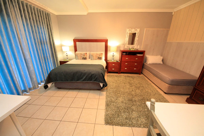 This room features a private entrance, a queen-size and Single bed and an en-suite bathroom fitted with a shower, toilet and basin. The room is equipped with a large flat screen TV with selected DStv channels, CD/DVD player, free Wi-Fi, fridge and coffee/tea station, microwave and mini bar..