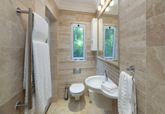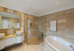 Das Hauptschlafzimmer ist mit einem Kingsize-Bett ausgestattet und verfügt über ein eigenes Badezimmer mit Badewanne, Dusche, Toilette und Waschbecken. Dieses Schlafzimmer ist nach Westen ausgerichtet und bietet Blick auf den westlichen Kopf. Das zweite Schlafzimmer ist mit einem Queensize-Bett ausgestattet und verfügt über ein eigenes Badezimmer mit Badewanne, Dusche, Toilette und Waschbecken. Dieses Schlafzimmer ist nach Nordwesten ausgerichtet und bietet Blick auf den Western Head und die Lagune.