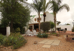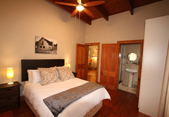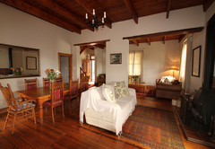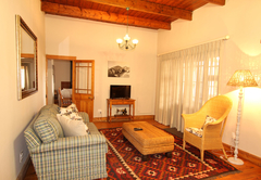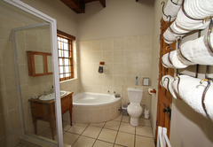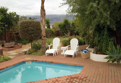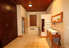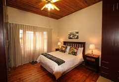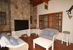 The house sleeps 16 guests in five bedrooms. Four of the rooms have en-suite bathrooms. All rooms have a ceiling fan and hairdryers. There is an upstairs lounge area with four double beds, a twin bed, a TV with DStv and a DVD machine. This area opens out onto a patio with mountain views. There is another TV lounge downstairs with DStv. The kitchen is fully equipped with everything you will need for your self catering stay. All 5 bedrooms fitted with a ceiling fan (4 en-suite). Main bedroom: Spa bath, air-con, double shower and basins. Open plan with separate toilet. Full Kitchen. DSTV, VHS and DVD machine. Double garage. Alarm and Burglar Bars. BBQ and plunge pool.