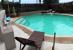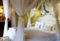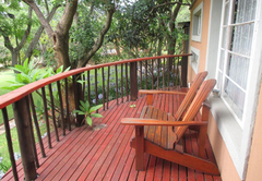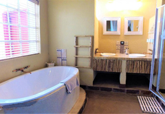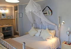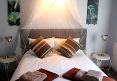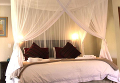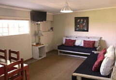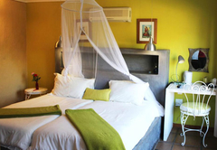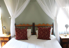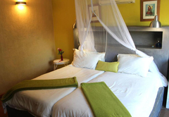 This bedroom comes with a double bed and a sleeper couch. An en-suite bathroom (with a bath and shower) is available with back garden views. The room has a TV with DStv, tea / coffee tray and air-conditioning.
