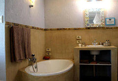The bedroom is attached to the main guest house but has a private entrance. This room has a king-sized bed and an en-suite bathroom (with a bath and shower). Unfortunately, no views are available.