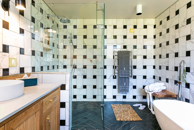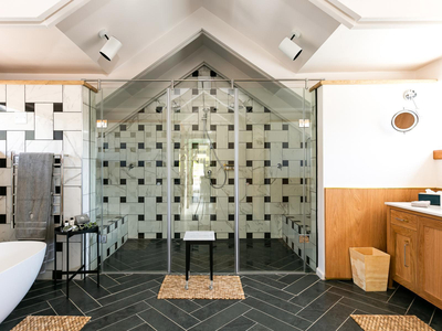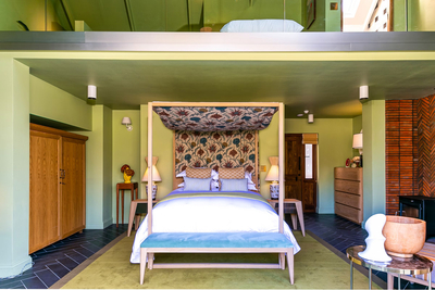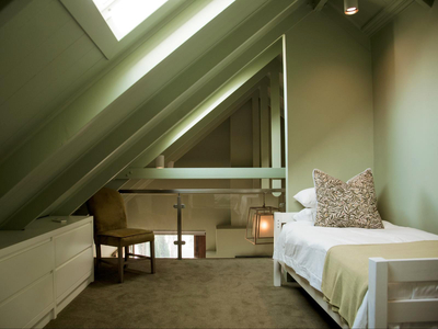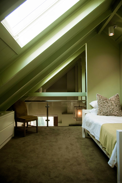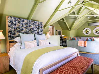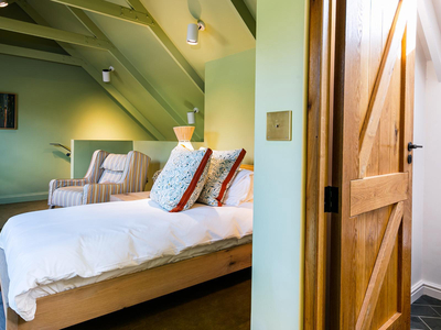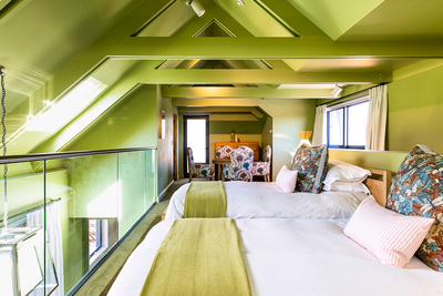 This spacious suite is set in a quieter section of the guesthouse and offers peaceful garden views, making it an ideal escape for couples or small families. The main level features a queen-size bed, a full en-suite bathroom with a separate tub and shower, and a comfortable lounge area. A loft above includes two single beds and an additional shower, perfectly suited for guests under the age of 18.