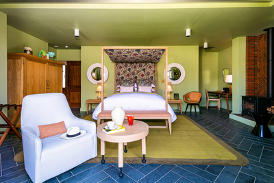 The spacious Premier / Herehuis Suite offers an inviting outdoor patio with elegant furniture, perfectly positioned to overlook the Bergkamp, home to free-roaming antelope and giraffes. Designed for comfort and relaxation, the suite features luxurious bedding, air conditioning, and a cosy fireplace, ensuring a restful stay for up to two adults.