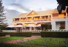 Entspannen Sie auf den bequemen Rohrmöbeln im Kolonialstil mit weitem Blick auf die Arniston-Dünen.