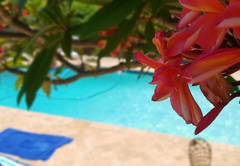 Die Gästelounge führt in den Innenhof mit einem strohgedeckten Lapa-Bereich und einem Swimmingpool. Für Fahrzeuge stehen sichere Parkplätze zur Verfügung.