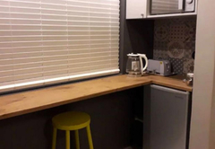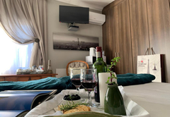 The Petite Room is a cosy room with a double bed and en-suite bathroom with a shower. The room has a kitchenette with a two plate stove, microwave, kettle toaster, fridge and a dining area. In addition, each room contains free Wi-Fi internet, air conditioning, a TV with selected satellite channels, and Wi-Fi.