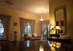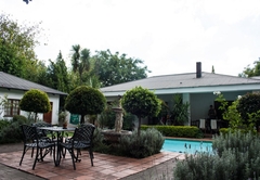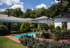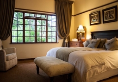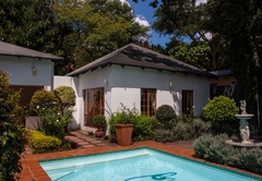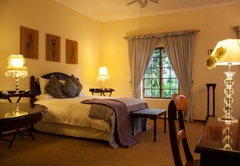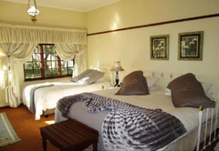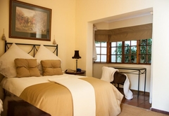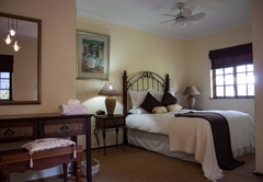 Very spacious mahogany-styled room, with queen and one 3 quarter bed and full en-suite bathroom. A view of the swimming pool and the tranquil garden creates the relaxing atmosphere that you deserve. Tastefully decorated rooms each with en-suite bathrooms and a range of extra luxuries such as private entrances, colour TV with DSTV and video channel. Radio / Clock and tea making facilities