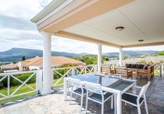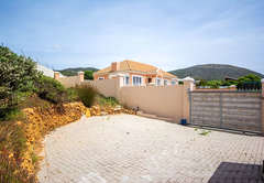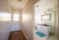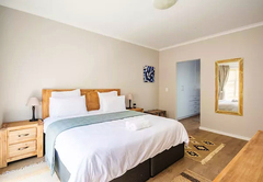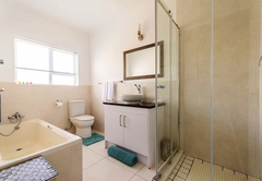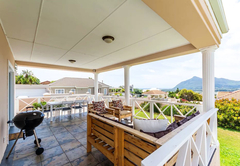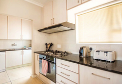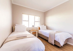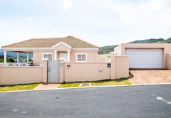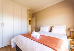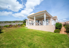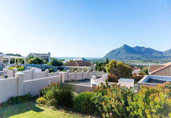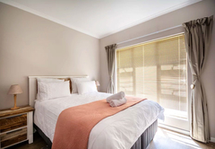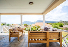 Capri House can accommodate up to six guests in three bedrooms. The house has two bathrooms, an open plan kitchen, dining and living area. The first bedroom is furnished with a King-size bed and the en-suite bathroom is fitted with a bath, shower, toilet and basin. The second bedroom is also furnished with a King-size bed and the third bedroom is furnished with two single beds. These two rooms share a bathroom fitted with a shower, toilet and basin. The kitchen is well-equipped for self catering and includes a fridge-freezer, stove, oven, kettle, and toaster. The dining area has a six seater dining table and chairs. The lounge, which is elegantly decorated and furnished with couches, a fireplace and a flat-screen TV opens to a covered patio with outdoor seating and braai facilities. The house has a beautiful garden with ample space for children to run around in.