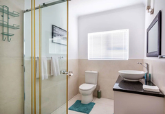 Das erste Schlafzimmer ist mit einem Kingsize-Bett ausgestattet und das eigene Badezimmer ist mit Badewanne, Dusche, WC und Basin ausgestattet. Das zweite Schlafzimmer ist auch mit einem Kingsize-Bett ausgestattet und das dritte Schlafzimmer ist mit zwei Einzelbetten ausgestattet. Diese beiden Zimmer teilen sich ein Badezimmer mit Dusche, WC und Waschbecken.