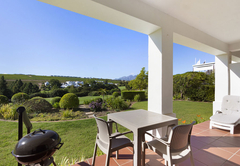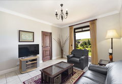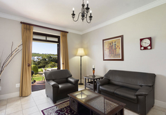 De Zalze Winelands Golf Lodge 5 is furnished with a King-sized bed , made from two three-quarter beds in the bedroom, which also leads to a private en suite bathroom fitted with a bath, shower, toilet and basin. With an open-plan living room, dining area and a kitchen that leads onto a spacious patio where you can enjoy a braai, this apartment with a mountain view offers its visitors a cosy atmosphere. There is a dining table in the kitchen that can accommodate two people and is fully furnished for your self-catering requirements. The living room has a TV with DStv access and there is Wi-Fi available, allowing you to spend a relaxing night indoors with your loved ones. A sliding door opens up to a smaller garden where you may take in lovely views of nature as soon as you wake up.