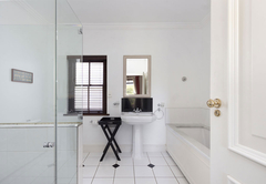 De Zalze Winelands Golf Lodges 5 ist mit einem Kingsize-Bett ausgestattet, das aus zwei Dreiviertelbetten im Schlafzimmer besteht, das auch zu einem privaten Badezimmer führt, das mit Badewanne, Dusche, Toilette und Waschbecken ausgestattet ist.