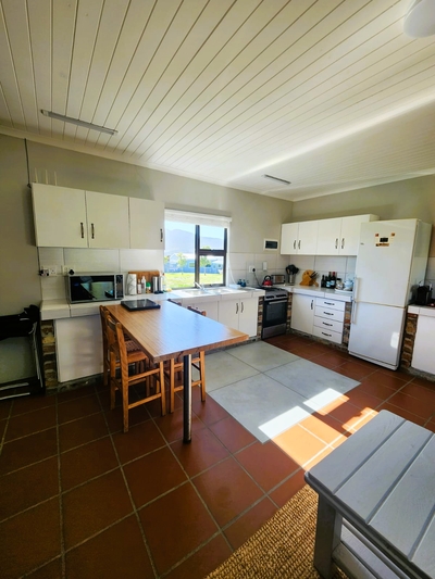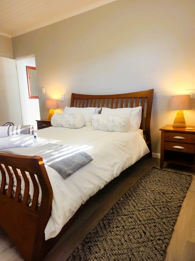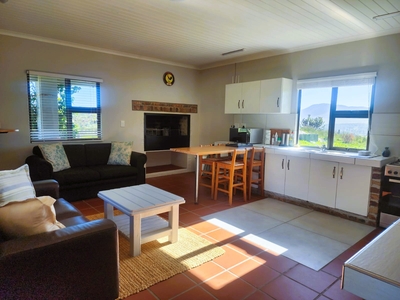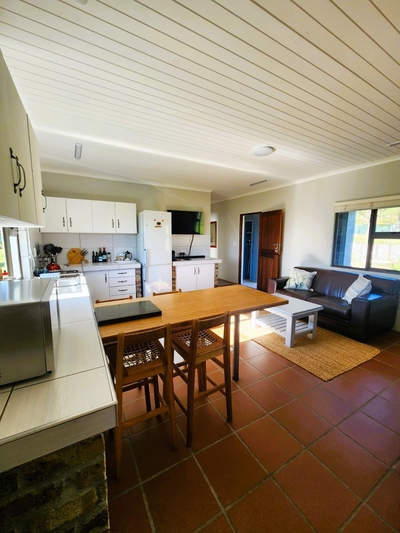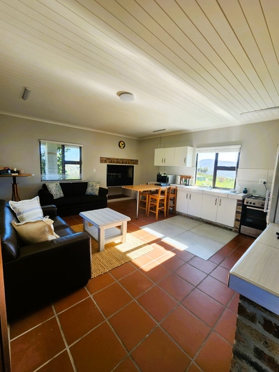 The open-plan living area is designed for comfort, with a cozy seating area, a TV, an indoor braai, and a dining table. The kitchen is fully equipped with modern conveniences, including a fridge-freezer, stove, oven, microwave, and facilities for making coffee and tea. Complimentary Wi-Fi is available throughout the cottage.