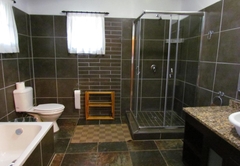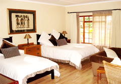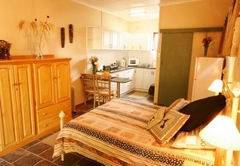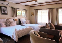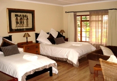 The Deluxe Double Room is furnished with a double and a single bed. There is also a kitchen, a dining and lounge area including a TV with DStv. The bathroom is fitted with a shower, bath, toilet and a basin. The kitchenette is fully equipped for self-catering.