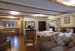 This Deluxe Double Room is an air-conditioned room with bedroom, lounge, dining room, kitchen and full bathroom. Facilities include air-conditioning, bar fridge, TV MNET Satellite TV. No smoking. Tea and coffee making facilities.