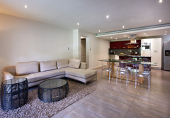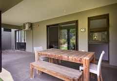 The modern two bedroom self catering apartment boasts 160 sqm of living space. Both bedrooms are spacious, beautifully decorated and have an en-suite bathroom. The living area is well laid out with state of art kitchen equipment and a large double door fridge. There is a six seater dining table, a comfortable couch and a flat screen TV. The living area leads through to a covered patio with outdoor furniture.