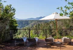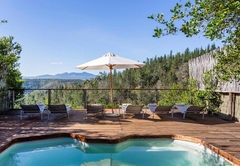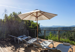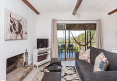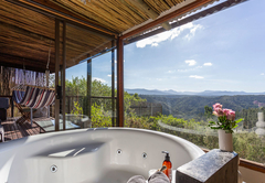 Schiebetüren führen zu einem Deck mit Hängematte, Tisch und Stühlen und einem Gas Weber Braai. Das große geschlossene Whirlpool / Spa -Bad auf dem Deck bietet einen spektakulären Blick und ist offen für das Schlafzimmer.
