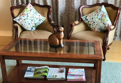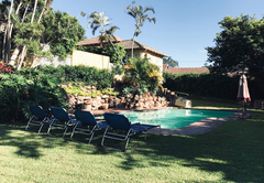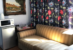 The Twin Room with View is furnished with a King-size bed or two single beds. There is a private bathroom with a shower in the hall. The room has a seating area, private balcony and lovely views. Room facilities include air-conditioning, a fridge, microwave oven, toaster, kettle, coffee and tea station, ironing facilities, DStv (Hotel package) and free Wi-Fi. There is a spacious, private balcony, a swimming pool, landscaped garden, braai facilities and on-site parking. The rooms share a communal kitchen.