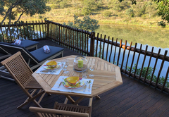 Draußen ist eine Terrasse mit einem Tisch und zwei Sonnenliegen. Es gibt einen Braai mit Blick auf den schönen Damm. Ein Open-Air-Braai befindet sich 50 m den Hügel hinauf vom Zelt mit herrlichem Blick auf den Damm und die Berge. Brennholz wird gestellt.