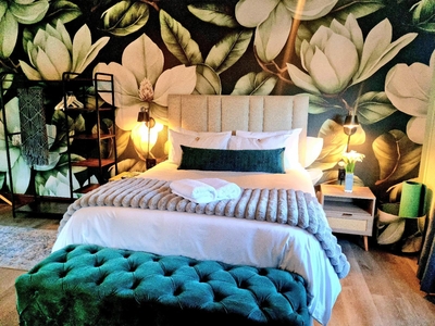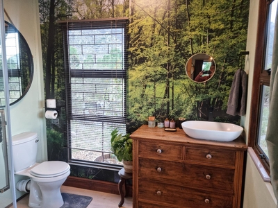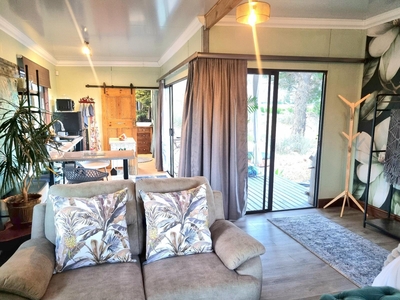 The private bathroom offers a separate tub and shower along with complimentary amenities and a hairdryer. Outdoors, guests can relax on the patio furnished with comfortable seating, enjoy a meal in the outdoor dining area, or make use of the braai facilities. With mountain and garden views, a private hot tub, and peaceful surroundings, this cabin is an inviting hideaway for those seeking rest and romance in nature.