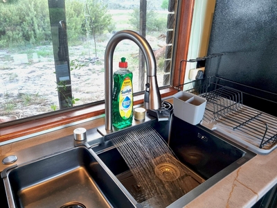 Mountain Spring Cottage consists of an open plan kitchen and living area, with a comfortable double sleeper couch. For rainy days in winter, there is a fireplace in the living area. The spacious porch with built in braai area has a spectacular view of the mountains. For the adventurous there is an outside bath tucked away behind the rocks with hot water and breathtaking surroundings. There are two bedrooms, one with a double bed and the other has two single beds. The bathroom has a shower. The cottage has TV with DStv Access Package. This cottage is 150m away from the splash pool.