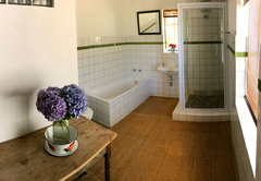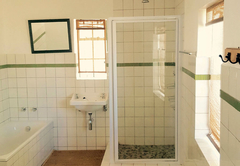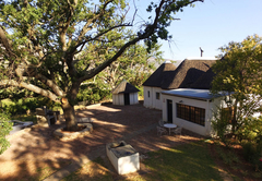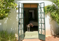 The thoughtfully restored thatched cottage has served as secondary house and bachelor's cottage to the main farm since the 1940s. The cottage is an extended rondawel with three bedrooms: two doubles and one sleeping four on bunk beds. One double room claims a fireplace, the other the en-suite bathroom (shower and bath). A second bathroom serves the rest. All linen and towels are provided.