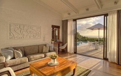 Designed for comfort, the suite includes a private balcony and a well-appointed sitting area, along with thoughtful touches such as air conditioning, a ceiling fan, a work desk, and a secure in-room safe. Modern amenities include complimentary Wi-Fi, a flat-screen TV with DSTV/Satellite channels, a telephone, and voltage adaptors for international travellers.