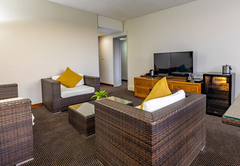 Luxury Suite is furnished with an extra length King-size bed. The en-suite bathroom is fitted with a shower, toilet and basin. Each room has tea / coffee making facilities, a hairdryer, TV, air-conditioning, a desk, fridge and bathroom amenities. A large pool, gym and safe parking are available to all guests.