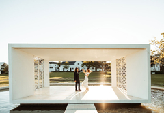 Der Hazendal Pavilion ist ein Zusammenspiel von Natur und eleganter Architektur und eine beeindruckende Kulisse für den Austausch von Gelübden. Er schwebt mit müheloser Anmut in der Mitte eines Teichs und bietet einen perfekten Blick auf die Gärten, das Homestead und die fernen Bottelary Hills und Simonsberg.
