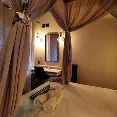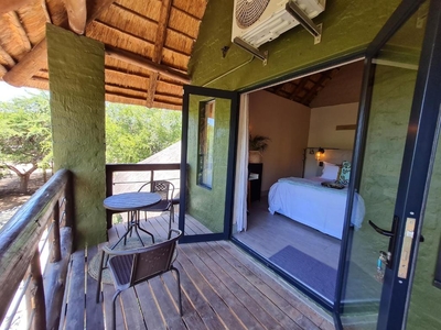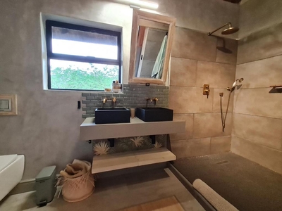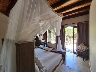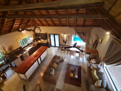 Croc Orvyll's Kruger Lodge is an exclusive use, self catering thatched holiday home that is beautifully decorated. The double-storey residence features three en-suite bedrooms and a loft, comfortably accommodating up to nine guests. Sleeping arrangements include one king-size bed, three queen-size beds, one three-quarter bed, and a sleeper couch. The kitchen is fully equipped for self-catering, complete with a stove, oven, fridge-freezer, and microwave. The expansive open-plan living area provides ample seating and a television with full PVR DStv. Outdoors, guests can enjoy a spacious entertainment area and a swimming pool. The rustic braai area promises memorable evenings, enhanced by the sounds of lions roaring nearby and the beauty of the night sky. Two covered parking bays are available for convenience. Facilities: • Swimming pool