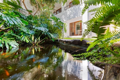 This upstairs, air-conditioned deluxe room is furnished with a queen size bed. Private balcony. En-suite bathroom with separate walk in shower and a bath and double vanities. Other luxuries include Egyptian cotton linen and Turkish towels. Microwave, TV, safe, bar fridge, hairdryer, iron and ironing board. Free wi-fi.