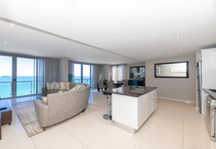 Infinity Superior Apartments are situated on the 10th floor and have two bedrooms and two bathrooms. Both rooms are furnished with a Queen-size bed and a bunk bed, sleeping two adults and two children per room. The first bathroom has a bath with a hand shower, hand basin and toilet and the second bathroom has a shower, washbasin and toilet. The rooms have ceiling fans with built-in cupboards and a dressing table with a mirror. The large open plan living area consists of kitchen with a toaster, kettle, microwave oven, fridge/freezer, a dishwasher and washing machine, a comfortable dining area and lounge. The lounge has a flat screen TV with satellite channels and Wi-Fi as well as sliding doors that lead onto a stand-on balcony, from where you can enjoy the most spectacular sunsets.