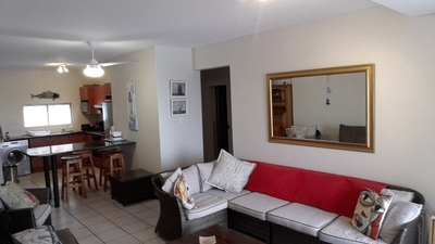 Die Lounge verfügt über reichlich Sitzgelegenheiten in Form einer Eckcouch, einer zusätzlichen Couch und einem Stuhl. Es gibt einen Fernseher mit einer Auswahl an DSTV-Kanälen und eine Schiebetür, die auf den Balkon führt, wo Sie die Gartenmöbel nutzen und den Blick auf den Strand genießen können.
