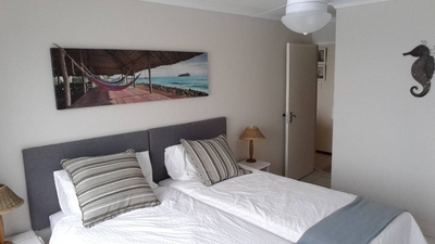 Isikulu 27B is a fantastic and bright modern two bedroom apartment where you can fall back into its comfy couches, chill on the balcony and be hypnotised by the waves crashing on the shore. This two bedroom apartment sleeps four guests in two bedrooms. The main bedroom has two single beds that can be moved together to make a large king bed with sliding doors out to the balcony. The second bedroom has two comfortable single beds. The lounge has ample seating in the form of a corner couch, an additional couch and a chair. There is a TV with a selection of DStv channels and a sliding door that opens out to the balcony where you can make use of the patio furniture and look out at the beach. The modern kitchen has a breakfast bar with four bar stools and includes a washing machine, oven, stove top, microwave, kettle, crockery and cutlery. While here you can make use of the lovely crystal blue swimming pool and the braai / barbeque facilities.