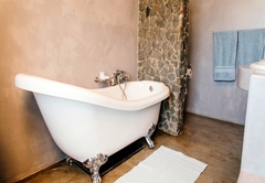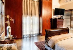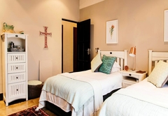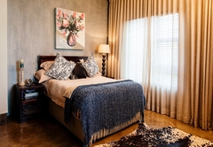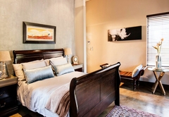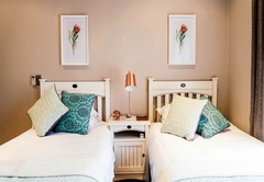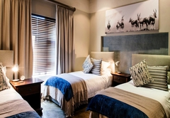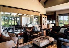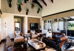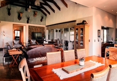 The lodge can accommodate up to 19 guests in a number of bedrooms with an open-plan kitchen, dining and lounge area, and a loft kids play room. The first bedroom is furnished with a Queen-size bed. The second bedroom is furnished with a double bed and one single bed. The third bedroom is furnished with three single beds. The fourth bedroom is furnished with two single beds. Each room contains a digital safe, hairdryer, air-conditioning, and cupboards. The large kitchen is fully equipped for self-catering and includes a stove and oven, kettle, microwave, a double-door fridge-freezer, and a dishwasher. There is a cold room for beverages. The dining area features a large dining table and chairs. The lounge boasts comfy chairs and couches, a fireplace, and a 62-inch TV with surround sound, a DVD player, and full DStv. The lounge opens to a patio with outdoor dining furniture and braai facilities.