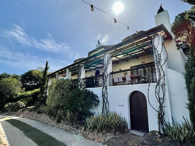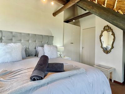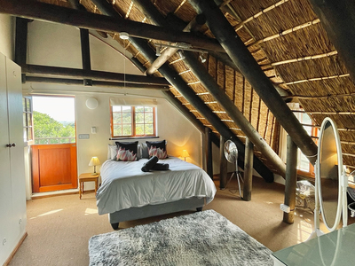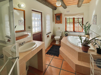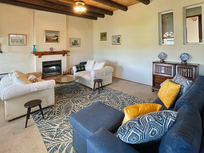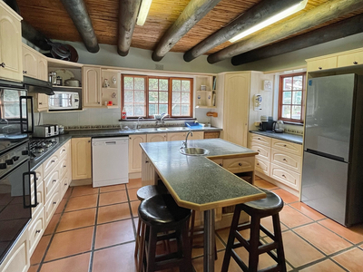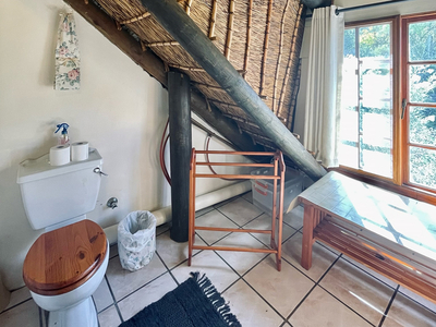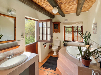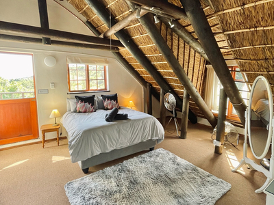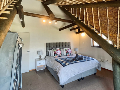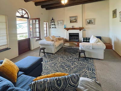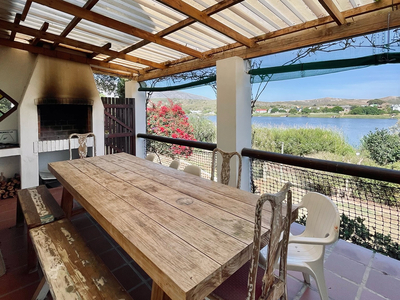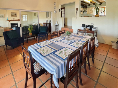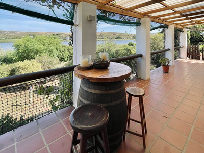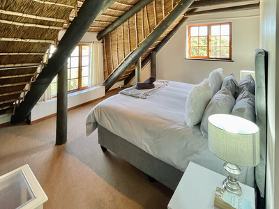 This residence provides exceptional privacy and tranquility, offering access to expansive private farmland ideal for walking, cycling, birdwatching, and spotting small game. Renowned for its breathtaking sunset views, it stands as one of the premier locations on the river. Designed to accommodate one to three families, the spacious holiday house comfortably sleeps up to eight adults and four children. It features six well-appointed bedrooms, including a dedicated children's room, and three bathrooms. The main bedroom, located on the ground floor, boasts a queen-size bed, a cozy lounge area with a fireplace, a walk-in dressing room, and an en-suite bathroom equipped with a corner bath, shower, toilet, washbasin, and bidet. Upstairs, guests will find four additional bedrooms: the second bedroom has a double bed, the third offers a queen-size bed, while the fourth and fifth bedrooms each contain double beds. The sixth bedroom, specifically designed for children, features two single beds and a bunk bed. The upstairs rooms share a bathroom that includes both a bath and a shower, along with a toilet and washbasin. There is also a separate outside room that was originally intended as domestic quarters. This space is perfect for a teenager seeking independence or an elderly parent who prefers to avoid stairs; it includes a single bed and an en-suite shower, toilet, and washbasin. An inviting upstairs TV lounge is equipped with a television and DVD player, along with a selection of DVDs and board games for family entertainment. Guests can connect to DStv if they bring their own smart card. For those needing internet access, uncapped Wi-Fi is available for an additional fee. The fully equipped kitchen caters to all self-catering needs, featuring two fridge-freezers, an extra fridge, a dishwasher, washing machine, tumble dryer, microwave, kettle and toaster. The downstairs lounge offers comfortable seating and a fireplace, while the dining area includes an eight-seater table. This dining space opens onto a large covered patio, which hosts a twelve-seater table, a four-seater wine barrel table with stools, additional seating, and a built-in braai equipped with two potjie pots. The thatched roof serves as a natural insulator, maintaining a cool atmosphere during the hot summer days and providing warmth on chilly winter nights. With a spacious patio and built-in braai, guests can enjoy panoramic views of the river and Potberg, while savoring stunning sunsets and keeping an eye on their fishing rods at the jetty. Surrounded by 22.5 hectares of land, which was formerly a working farm for raising baby ostriches, this property also serves as one of the standby landing areas for the SS Kadie as it awaits favourable tides during its journey to Malgas.