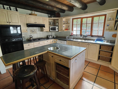Die voll ausgestattete Küche umfasst zwei Kühl-Gefrierkombinationen, einen zusätzlichen Kühlschrank, einen Geschirrspüler, eine Waschmaschine, einen Wäschetrockner, eine Mikrowelle, einen Wasserkocher und einen Toaster. Der Wohnbereich im Erdgeschoss besteht aus einer gemütlichen Lounge mit Kamin und einem Essbereich mit einem Tisch für 8 Personen. Der Wohn- und Essbereich öffnet sich zu einer großen, überdachten Terrasse, die einen Esstisch für 12 Personen, einen Weinfasstisch für 4 Personen, zusätzliche Sitzgelegenheiten und einen eingebauten Grill mit zwei Potjie-Töpfen bietet.